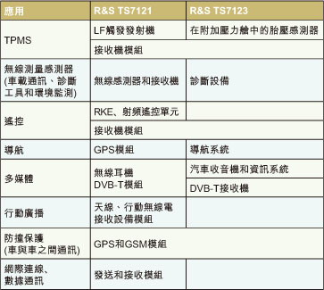 一些更新的應(yīng)用包括用于確保轎車和卡車安全的胎壓監(jiān)測系統(tǒng),以及可靠地實現(xiàn)電視接收的DVB-T接收機(jī)。在某些情形下,具備射頻接口的診斷系統(tǒng)已經(jīng)被安裝在汽車維修中心和應(yīng)急支援中心。其它應(yīng)用還包括:用于監(jiān)測發(fā)動機(jī)艙溫度、壓力和速度參數(shù)的傳感器。
