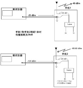 假設(shè)在最壞情況下,手機(jī)1距離手機(jī)2 1米遠(yuǎn)(假定只有遠(yuǎn)場(chǎng)效應(yīng),近場(chǎng)因素很難考慮),將兩個(gè)手機(jī)平行對(duì)準(zhǔn)且手機(jī)之間沒(méi)有衰減材料,則手機(jī)2的天線會(huì)收到一個(gè)高達(dá)-83.92dBm的信號(hào)。這樣手機(jī)2的接收器就會(huì)有-103.92dBm干擾信號(hào),因?yàn)榧僭O(shè)天線到過(guò)電開(kāi)關(guān)的衰減為20dB。這個(gè)例子說(shuō)明了一個(gè)手機(jī)在另一手機(jī)接收信道上產(chǎn)生噪聲的一般原因,根據(jù)例中所做假設(shè),在實(shí)際執(zhí)行中還有很多情況會(huì)引起不同的結(jié)果,這也為認(rèn)識(shí)哪種噪聲會(huì)從一個(gè)手機(jī)進(jìn)入另一個(gè)手機(jī)信道提供了基礎(chǔ)。方位、距離、開(kāi)關(guān)衰減、屏蔽、天線設(shè)計(jì)和實(shí)現(xiàn)方式等,這些因素都會(huì)在引入噪聲的整個(gè)轉(zhuǎn)換中發(fā)揮作用。