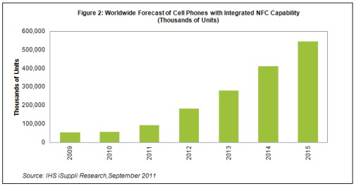 據(jù)IHS iSuppli公司的移動與無線通信研究報告,由于市場對移動電子支付和其它應(yīng)用的需求旺盛,2015年采用近距離通信(NFC)技術(shù)的手機出貨量將是是2010年5620萬部的10倍,達到5.447億部。