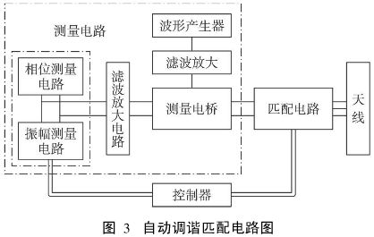 手工匹配采用的是阻抗分析儀或者網(wǎng)絡(luò)分析儀,網(wǎng)絡(luò)分析儀是用定向耦合器來測量天線電路的反射系數(shù)。但使用定向耦合器有幾個主要的缺點,例如功率損耗大和很難嵌入到IC芯片。故而本文在電路中不使用耦合器,從圖3看出,測量電路包含以下4部分。