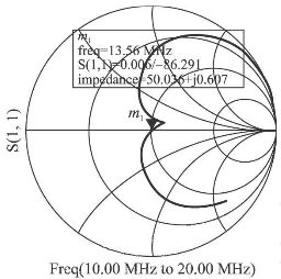 手動調(diào)諧即是交替不斷調(diào)整電容C1、C2 的值,同時觀察曲線變化,直到在所要求的頻率點S11等于0。圖2為某一天線電路在頻率在10~20MHz之間變化時,其反射系數(shù)的變化曲線,其中,標(biāo)記13. 56MHz的點, S11值近似為0,達到了匹配要求。