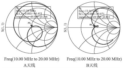 在載波頻率為13. 56 MHz時,通過在TX1 和TX2 兩點測量天線線路的反射系數(shù)(即參數(shù)S11 )來手動調(diào)諧,直到天線電路的輸入阻抗達到目標(biāo),計算方程如下: