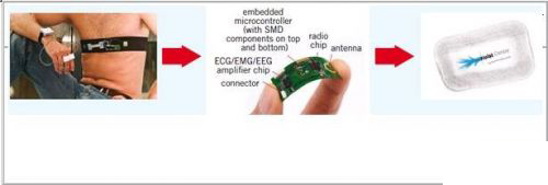 IMEC和霍爾斯特中心正在開發(fā)一款心電圖綁帶,該產(chǎn)品像運動員所用的傳統(tǒng)心臟監(jiān)測帶一樣使用。這款帶子不僅能監(jiān)測心跳,還可以記錄和傳送完整的心電圖。該設備可供有心臟病的戶外活動愛好者非常方便地使用,或在競技活動中使用(這款帶子已經(jīng)在布魯塞爾馬拉松里進行過測試)。目的難題在于要將系統(tǒng)小型化和實現(xiàn)足夠水平的自立性。根據(jù)應用的不同,可能是要能使用幾天或永久性使用。最終目標是要將這款電子心臟專家集成到一個小盒子中,而這個小盒子要能附著在一條帶子上(圖4),或者能嵌入到一件襯衫里則更好。