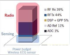 功耗可通過檢查傳感器的單獨標準構(gòu)件來預算心電圖傳感器節(jié)點的功率:傳感和讀取單元、無線通訊、數(shù)字信號處理器(DSP)和供電單元。顯然,節(jié)點中最耗電的是射頻芯片,射頻芯片負責傳感器數(shù)據(jù)的無線傳輸(圖5)。通常,實現(xiàn)無線通訊功能所耗費的功率占總功率預算的50%至85%。