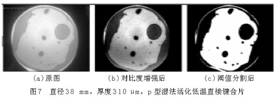 圖6(a)和圖7(a)中,圓形區(qū)域是要鍵合的圓片,其中明區(qū)為鍵合上的地方,暗區(qū)為未鍵合上的地方,圓形區(qū)域(即鍵合圓片)以外為圖像背景。從圖上可以大致地看出空洞(未鍵合區(qū)域)的分布、個(gè)數(shù)和大小等。為了獲得更為準(zhǔn)確的數(shù)據(jù)信息,借助圖像處理程序?qū)D片(a)進(jìn)行對比度增強(qiáng)、平滑、分割等一系列處理,可獲得圖(b),(c),從而得到鍵合率。樣品1的鍵合率為28.12%,鍵合率很低,并且從圖6中空洞的分布可以看出,樣品1鍵合得很不好。樣品2的鍵合率為66.12%。比較圖6和圖7,樣品2的鍵合質(zhì)量明顯優(yōu)于樣品1,可以說明鍵合圓片越薄,越容易鍵合。可以從平板理論理解這一鍵合現(xiàn)象,圓片越薄,界面表面能克服圓片翹曲貼合到一起所需要的力越小。