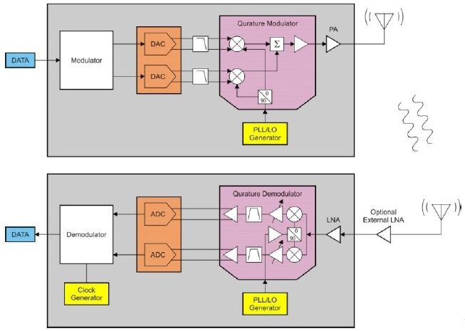 典型的低功耗無線鏈路由一個(gè)發(fā)送器件和一個(gè)或多個(gè)接收器件組成。發(fā)送器件由一個(gè)調(diào)制器、合成器、升頻混頻器和一個(gè)功率放大器(PA)組成。接收機(jī)由互逆器件、低噪聲放大器(LNA)、降頻混頻器、合成器和解調(diào)器組成。