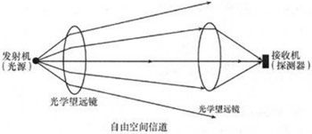 一個(gè)光無線通信系統(tǒng)構(gòu)成如圖1所示,包括三個(gè)部分:發(fā)射機(jī)、信道和接收機(jī)。光發(fā)射機(jī)的光源受到電信號的調(diào)制,并通過作為天線的光學(xué)望遠(yuǎn)鏡,將光信號經(jīng)過空間送到接收端的望遠(yuǎn)鏡。高靈敏度的光接收機(jī),將望遠(yuǎn)鏡收到的光信號再轉(zhuǎn)換成電信號,值得注意的是,發(fā)送端和接收端之間,必須是互相視線可見的,兩終端之間不能有阻擋。由于大氣空間對不同光波長信號的透過率有較大的差別,可以選用透過率較好的波段窗口。光無線系統(tǒng)通常使用0.85μm或1.5μm紅外波段。0.85μm的設(shè)備相對便宜,一般應(yīng)用在傳輸距離不太遠(yuǎn)的場合。1.5μm的設(shè)備價(jià)格要高一些,但在功率、傳輸距離和視覺安全方面有更好的表現(xiàn)。 1.5μm的紅外光波大部分都被角膜吸收,照射不到視網(wǎng)膜,因此,相關(guān)安全規(guī)定允許1.5μm波長設(shè)備的功率可以比0.85μm的設(shè)備高2個(gè)等級,1.5μm波長的光無線通信具有更廣闊的使用前景。