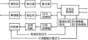 隨著通信技術(shù)的發(fā)展,對FSO系統(tǒng)的傳輸速率和距離均提出了更高的要求,如果要提高這兩個(gè)技術(shù)指標(biāo),就必須要增大激光器的發(fā)射功率和提高接收機(jī)的靈敏度,但擴(kuò)束法和多束法對性能指標(biāo)的改善有限,于是動態(tài)跟蹤法就應(yīng)運(yùn)而生,即利用伺服系統(tǒng)通過反饋裝置獲得光束偏差信息,調(diào)整可調(diào)微鏡,使光束時(shí)刻對準(zhǔn)接收器。采用動態(tài)跟蹤技術(shù)的FSO系統(tǒng)設(shè)備功能結(jié)構(gòu)如圖3所示,一般采用雙反饋方式,外反饋是位置探測器輸出的入射激光束的位置誤差信號,內(nèi)反饋是伺服系統(tǒng)控制的可調(diào)微鏡的位置信號,入射激光束通過接收光學(xué)系統(tǒng)后,聚集到位置探測器上,位置探測器將激光束的位置誤差信號輸出到主處理器。同時(shí)可調(diào)微鏡位置探測器將探測到的微鏡位置信號送到控制處理器中,控制處理器利用優(yōu)化的跟蹤算法進(jìn)行計(jì)算,輸出的角度控制信號控制伺服系統(tǒng)調(diào)整可調(diào)微鏡,使接收光學(xué)系統(tǒng)始終對準(zhǔn)入射激光束。