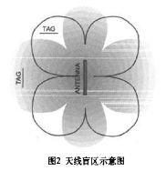 由于環(huán)形天線的電磁場在其臨近區(qū)域分布不均勻,因此會出現(xiàn)讀寫盲區(qū)。如圖2中黑線勾勒出的范圍之外區(qū)域一般為單個天線的讀寫盲區(qū)。經(jīng)反復(fù)實驗證明將電子標(biāo)簽擺放位置轉(zhuǎn)到與最佳位置成40°角區(qū)域時,一般可正常讀寫操作。