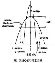 由式(2)可看出,天線的傳輸帶寬B與品質(zhì)因數(shù)Q成反比。因此,過高的品質(zhì)因數(shù)將導(dǎo)致帶寬縮小,降低讀寫器的調(diào)制邊帶信號幅度,導(dǎo)致讀寫器無法與標(biāo)簽通信。天線Q值與3 dB帶寬的關(guān)系曲線如圖3所示。由圖3可看出:環(huán)形天線與50 Ω的負(fù)載相連時,其Q值最好不超過30。為了優(yōu)化天線的性能。讀寫器匹配電路的駐波比應(yīng)小于1:1.2。