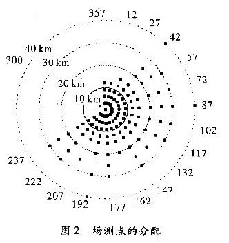 覆蓋測(cè)試是根據(jù)特定的半徑和幅角在圓周上進(jìn)行選點(diǎn)的,這些測(cè)試點(diǎn)的選擇總共包含18個(gè)不同幅角(12,27,42,58,72,87,102,117,132,147,162,177,182,207,222,287,300,357),對(duì)應(yīng)于以發(fā)射機(jī)為圓心的3,6,9,12,15,20,25,30和40 km這幾個(gè)半徑上。選點(diǎn)是出于幅角的考慮,展現(xiàn)了至少45 dBμV/m內(nèi)的場(chǎng)強(qiáng)估計(jì),并根據(jù)地形信息通過(guò)算法得到有用信息。圖2展示了場(chǎng)測(cè)選點(diǎn)的地形分配,測(cè)試點(diǎn)的具體參數(shù),如表2所示。