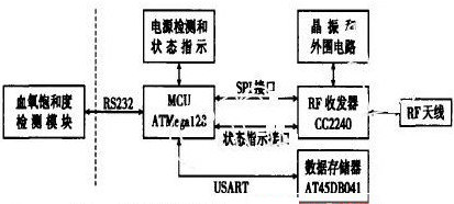 MCU部分是WPAN通信模塊的核心,完成通信模塊各組成部分的控制、協(xié)調(diào)和數(shù)據(jù)的加工。具體功能:通過RS232接口與血氧飽和度檢測(cè)模塊通信,實(shí)現(xiàn)對(duì)它的控制和配置,并接收檢測(cè)數(shù)據(jù);通過SPI接口和狀態(tài)指示接口實(shí)現(xiàn)對(duì)RF收發(fā)器的配置和檢測(cè),并完成發(fā)射和接收的數(shù)據(jù)交換;通過USART接口與數(shù)據(jù)存儲(chǔ)器連接,完成數(shù)據(jù)存儲(chǔ)器的讀寫操作;通過電源檢測(cè)和狀態(tài)指示部分,監(jiān)測(cè)電源電壓情況,并能通過狀態(tài)指示產(chǎn)生報(bào)警提示。