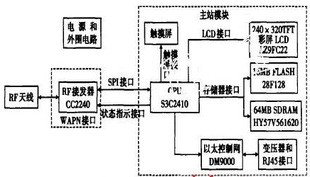 CPU部分完成主站各組成部分的控制、協(xié)調(diào)和數(shù)據(jù)的加工。具體功能:通過系統(tǒng)總線與存儲(chǔ)器相連,完成相關(guān)數(shù)據(jù)的加工、處理和存儲(chǔ);通過LCD接口與彩色液晶顯示器相連,實(shí)現(xiàn)信息的顯示,以實(shí)現(xiàn)人機(jī)交互;通過觸摸屏接口與觸摸屏相連,實(shí)現(xiàn)控制命令的輸入;通過總線接口與以太網(wǎng)控制器相連,可將檢測(cè)儀接入后臺(tái)支持網(wǎng)絡(luò),實(shí)現(xiàn)系統(tǒng)信息的集中化管理和與后臺(tái)管理系統(tǒng)的融合;通過SPI接口和狀態(tài)指示接口實(shí)現(xiàn)對(duì)RF收發(fā)器的配置和檢測(cè),并完成發(fā)射和接收的數(shù)據(jù)交換,實(shí)現(xiàn)與檢測(cè)儀移動(dòng)終端的通信;通過電源和外圍電路,實(shí)現(xiàn)對(duì)系統(tǒng)的供電?! ?br />
