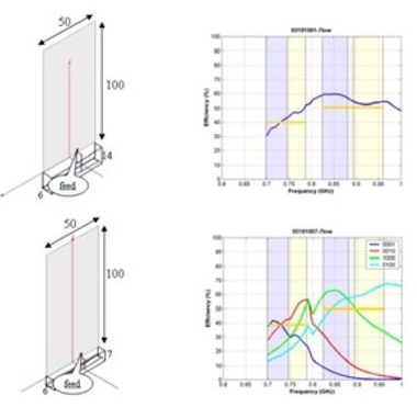 下面這個(gè)例子很好地說(shuō)明了調(diào)諧方法在天線體積減小方面帶來(lái)的好處。這里用3D電磁建模程序分析兩種不同的天線配置:一種是寬帶設(shè)計(jì);另一種是可以在相同頻率范圍內(nèi)調(diào)諧,但使用了4個(gè)調(diào)諧狀態(tài)的窄帶設(shè)計(jì)。