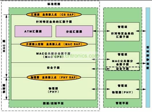 802.16 MAC協(xié)議是專門針對P2MP無線接入環(huán)境而設計的,可以支持諸如ATM、以太網(wǎng)和互聯(lián)網(wǎng)協(xié)議(IP)等傳輸協(xié)議,并且可以通過特定的匯聚層(如圖1所 示),適應未來的技術發(fā)展。MAC層還可以利用物理層來實現(xiàn)很高的數(shù)據(jù)吞吐量,同時提供符合ATM標準的服務質(zhì)量(QoS),如UGS、rtPS、 nrtPS和盡高帶寬(BE)(如圖2所示)。