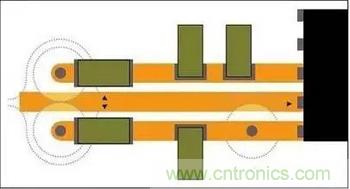 每個這些通孔都會在內(nèi)接地層上產(chǎn)生大于通孔直徑自身的禁入?yún)^(qū),提供制造空隙。這些禁入?yún)^(qū)很容易在回流路徑上造成中斷。一些通孔彼此靠近則會形成接地層溝,頂層CAD視圖看不見,這將導致情況進一步復(fù)雜化。圖2兩個電源層通孔的接地層空隙可產(chǎn)生重疊的禁入?yún)^(qū),并在返回路徑上造成中斷?;亓髦荒苻D(zhuǎn)道繞過接地層禁入?yún)^(qū),形成現(xiàn)在常見的發(fā)射感應(yīng)路徑問題。