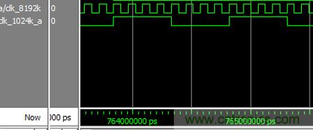 根據(jù)所需的時鐘頻率為1024kHz的時鐘,而晶振時鐘的頻率為8192kHz,晶振時鐘與所需的時鐘頻率恰巧是8倍的整數(shù)倍關(guān)系,因此需要對8192kHz的晶振時鐘進(jìn)行8分頻來獲得所需要的時鐘。根據(jù)整數(shù)倍分頻器的設(shè)計方法原理,通過ISE9.1邏輯設(shè)計工具,利用VHDL硬件描述語言來進(jìn)行8分頻的分頻器設(shè)計。然而8又是偶數(shù),所以需要設(shè)計的是偶數(shù)分頻器。對設(shè)計的內(nèi)容通過Modelsim6.5仿真軟件進(jìn)行仿真驗證,結(jié)果如圖3-1所示。