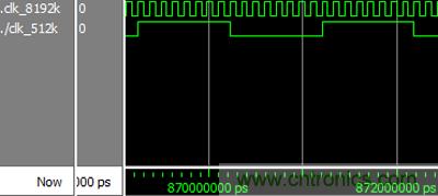 根據(jù)所需的時鐘頻率為512kHz的時鐘,而晶振時鐘的頻率為8192kHz,晶振時鐘與所需的時鐘頻率恰巧是16倍的整數(shù)倍關(guān)系,因此需要對8192kHz的晶振時鐘進(jìn)行16分頻來獲得所需要的時鐘。根據(jù)整數(shù)倍分頻器的設(shè)計方法原理,通過ISE9.1邏輯設(shè)計工具,利用VHDL硬件描述語言來進(jìn)行16分頻的分頻器設(shè)計。然而16又是偶數(shù),所以需要設(shè)計的是偶數(shù)分頻器。對設(shè)計的內(nèi)容通過Modelsim6.5仿真軟件進(jìn)行仿真驗證,結(jié)果如圖3-2所示。