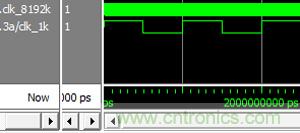 根據(jù)所需的時鐘頻率為1kHz的時鐘,而晶振時鐘的頻率為8192kHz,晶振時鐘與所需的時鐘頻率恰巧是8192倍的整數(shù)倍關(guān)系,因此需要對8192kHz的晶振時鐘進(jìn)行8192分頻來獲得所需要的時鐘。根據(jù)整數(shù)倍分頻器的設(shè)計方法原理,通過ISE9.1邏輯設(shè)計工具,利用VHDL硬件描述語言來進(jìn)行8192分頻的分頻器設(shè)計。然而8192又是偶數(shù),所以需要設(shè)計的是偶數(shù)分頻器。對設(shè)計的內(nèi)容通過Modelsim6.5仿真軟件進(jìn)行仿真驗證,結(jié)果如圖3-4所示。