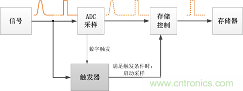 這就要靠觸發(fā)系統(tǒng)來(lái)實(shí)現(xiàn)。觸發(fā)的原理是一直監(jiān)控信號(hào)流,若發(fā)現(xiàn)信號(hào)滿足設(shè)定的觸發(fā)條件,觸發(fā)器記錄滿足條件的信號(hào),啟動(dòng)采樣;待數(shù)據(jù)采集完畢后,由控制器對(duì)信號(hào)進(jìn)行處理和顯示。具體如圖2所示。