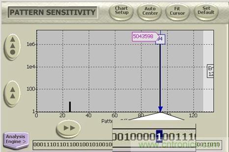 在客戶進(jìn)行誤碼測(cè)試的時(shí)候,由于鏈路的損耗和芯片的輸出特性,導(dǎo)致出現(xiàn)了誤碼,但客戶卻想知道究竟是哪一個(gè)bit位出現(xiàn)了誤碼,以定位誤碼出現(xiàn)的根源。設(shè)置Bert的輸出/輸入端設(shè)置為PRBS7的碼型,在誤碼分析功能里面選擇Patten Sensitivity,則可以直接觀察PRBS7的127個(gè)比特的每一位所出現(xiàn)誤碼的個(gè)數(shù),看最多誤碼所對(duì)應(yīng)的比特位的前后特性,如下圖十三,移動(dòng)光標(biāo)到任意一個(gè)比特上面,可以看到連續(xù)多個(gè)0而中間有一個(gè)1跳變的bit即127比特的第94比特出現(xiàn)誤碼的個(gè)數(shù)最多,達(dá)到5043598個(gè)誤碼。從而判斷由于鏈路ISI的影響導(dǎo)致突然的跳變位出現(xiàn)較高的誤碼率。