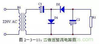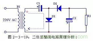 二倍壓整流電路還有另外一種形式的畫(huà)法,見(jiàn)圖2-3-21,其原理與圖2-3-18完全一致,只是表現(xiàn)形式不一樣。