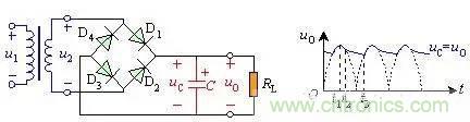 電容濾波一般負(fù)載電流較小,可以滿足td較大的條件,所以輸出電壓波形的放電段比較平緩,紋波較小,輸出脈動(dòng)系數(shù)S小,輸出平均電壓UO(AV)大,具有較好的濾波特性。