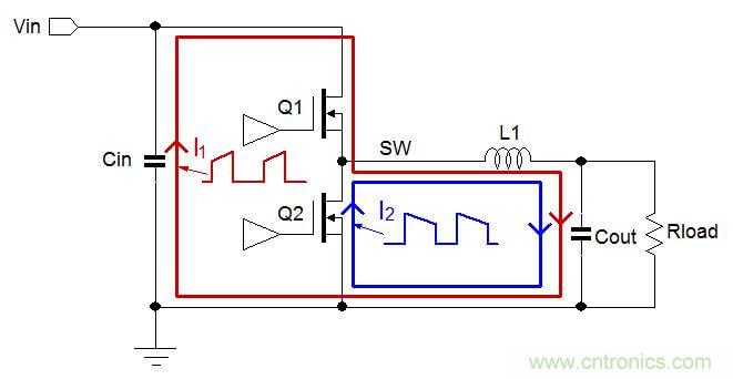 當上橋MOSFET Q1導通的時候,電流從電源流出,經(jīng)Q1和L1后進入輸出電容和負載,再經(jīng)地線回流至電源輸入端。在此過程中,電流中的交變成分會流過輸入電容和輸出電容。這里所說的電流路徑如圖2中的紅線所示,它被標注為I1。