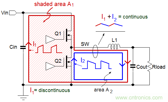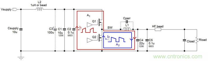 從電磁輻射的角度來看,圖3中存在陰影的A1區(qū)域是存在高電流變化率dI/dt的回路部分,這個回路將生成最多的高頻成分,因而在Buck轉(zhuǎn)換器的EMI設(shè)計中是需要被重點考慮的最關(guān)鍵部分。圖中A2區(qū)域的電流變化率dI/dt就沒有A1區(qū)域的高,因而生成的高頻噪聲也就比較少。