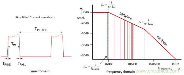 為了理解這能導致多大程度的改進,我們需要對不連續(xù)電流脈沖的高頻成分進行一番探討。圖6左側(cè)顯示的是簡化為梯形了的電流波形,其周期為TPERIOD,脈沖寬度為TW,脈沖上升/下降時間為TRISE。從頻域來看此信號,其中含有基頻成分和很多高次諧波成分,通過傅里葉分析可以知道這些高頻成分的幅度和脈沖寬度、上升/下降時間之間的關(guān)系,這種關(guān)系被表現(xiàn)在圖6的右側(cè)。