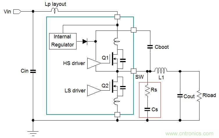 RC緩沖電路應當放置在緊靠開關(guān)節(jié)點和功率地處。在使用外部MOSFET開關(guān)的Buck轉(zhuǎn)換器中,RC緩沖電路應當直接跨過下橋MOSFET的漏極和源極放置。圖10示范了RC緩沖電路的放置位置。