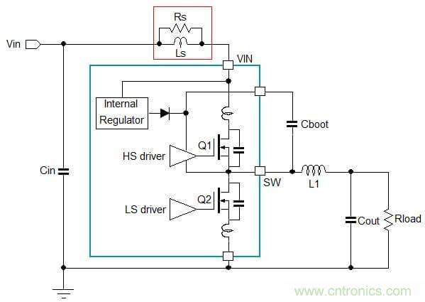 在理想狀況下,輸入、輸出電容對于Buck轉(zhuǎn)換器的開關(guān)電流來說都具有極低的阻抗。但在實際上,電容都存在ESR和ESL,它們都增加了電容的阻抗,并且導致上面出現(xiàn)額外的高頻電壓跌落。這種電壓跌落將在電源供應線路上和負載連接電路上形成相應的電流變化,見圖4。