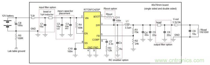 本章將示范在Buck轉(zhuǎn)換器的EMI設(shè)計中的不同方法所導致的影響。示范所使用的IC是RT7297CHZSP,一款800kHz工作頻率、3A輸出能力的電流模式Buck轉(zhuǎn)換器,采用PSOP-8封裝。測試中的電路工作在12V輸入下,輸出為3.3V/3A,測試所用電路顯示在圖12中。
