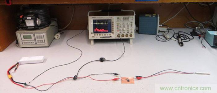 輸入線靠電池一側(cè)的接地端通過一只100Ω的電阻和實驗臺的地連接在一起,這就給整個電路提供了一個參考地,其阻抗很像EMC測試中的LISN網(wǎng)絡。