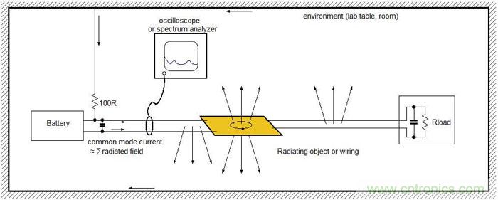 當被測試對象被放在實驗桌上時,其PCB上的電流回路和導線就會向周圍環(huán)境輻射出高頻能量,這些輻射信號又會自己找到路徑返回到測試對象上,并以高頻共模電流的形式出現(xiàn)在供電線上。這些供電線上的高頻共模電流會和板上的電流結(jié)合在一起,可被用著輻射狀況的指示信號。