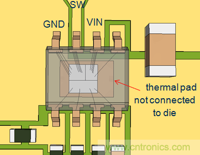 在RT7297CHZSP中,芯片底部的散熱焊盤是沒有和晶圓內(nèi)核連接在一起的,所以在PCB布局中將銅箔和散熱焊盤連接在一起并不能縮短CIN回路。它的上橋MOSFET和下橋MOSFET通過多根邦定線連接到VIN和GND端子,因而可以通過這兩個端子形成最短的回路。