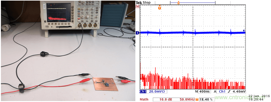 這種環(huán)形天線可以被連接到頻譜分析儀上,當你使它在PCB上方移動時,你就可以看到哪里會有比較強的高頻磁場。你也可以把它連接到一臺示波器上(使用50Ω的端子),示波器上就可以顯示出相應區(qū)域的切換噪聲水平。保持天線環(huán)和板子之間的相對位置和距離不變,對電路、PCB上的回路做出某些改變,你就可以知道噪聲水平在增加或是減少。