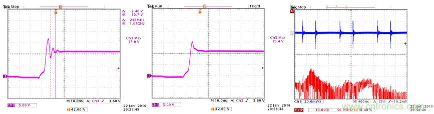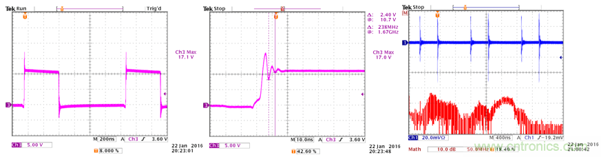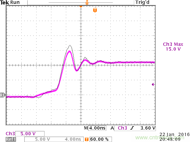 從實驗結(jié)果來看,開關(guān)切換波形上的過沖實際上已經(jīng)消失了,但還存在低頻的振鈴信號。
