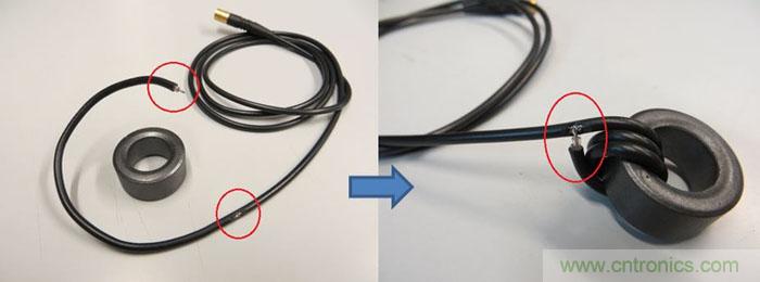 為了將測試工具和測試對象隔離開,最好是在電纜上加一個共模線圈,這可通過將引入分析裝置的電纜多次穿過一個扣合式的EMI鐵芯來實現(xiàn)。