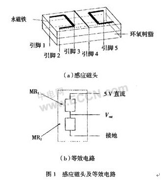 用銻化銦-銦共晶體薄膜磁阻元件制成MRCS的感應磁頭(圖1)主要由導線、絕緣基片、InSb-In磁阻元件MR1和MR2、永磁體、5個引腳等組成,另外加上起屏蔽和保護作用的金屬外殼。MR1和MR2是相對放置的一對磁阻元件,其阻值大致相等,導線置于MR1和MR2的對稱軸位置。其等效電路如圖1(b)。