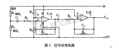 信號采集電路中的InSb-In薄膜磁阻元件采用三端差分型接法如圖1(b)所示,這種信號采集電路具有輸出信號較大和較強抑制溫漂的能力。信號處理電路采用阻容耦合型差動放大電路,在圖2中IC1和IC2為兩級差動放大,改變R2,R7,R5,R8的阻值可以調整放大倍數(shù)。集成運放的靜態(tài)電壓由R3和R6來調節(jié),考慮到通常磁頭內(nèi)的上、下兩個磁阻元件不完全平衡,MR1與MR2的阻值會有10%以內(nèi)的差別,在+5 V的工作電源下,信號采集的輸出端電壓在2.4~2.6 V。為了減少信號在磁頭與運放之間阻容耦合中的損失,一般把集成運放靜態(tài)電壓設置為低于2.5 V,取2 V比較合適。