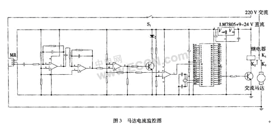 本文研制的電流傳感器已經(jīng)在馬達監(jiān)控方面獲得了實際應用。眾所周知,馬達一旦被意外卡死而停轉,電路中流過它的電流會遠遠高于正常工作的電流,而馬達長時間停轉的話,很容易被燒壞,本電流傳感器就是要感知馬達停轉的電流,從而把整個供電斷開,起到保護馬達的作用,其基本原理如圖3所示。