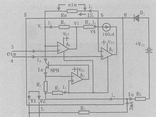 Rs為增益調(diào)節(jié)電阻,調(diào)節(jié)Rs可使輸入電壓ein在從最小值變到最大值時使輸出電流Io從4mA變到20mA。即△I=16mA的輸出電流。需要注意的是:為使Io不超過20mA,當(dāng)Rs=∞時,ein不應(yīng)超過1V,而當(dāng)Rs減小時,ein也應(yīng)相應(yīng)減小。