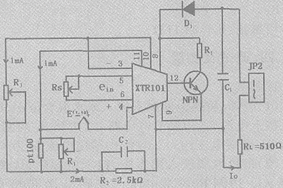 熱電偶作為感溫元件,采集溫度信號;鉑電阻作為補償電阻,補償熱電偶的冷端溫度;XTR101為小信號處理專用芯片,將輸入的微弱信號放大后便于遠(yuǎn)端傳輸;RL為遠(yuǎn)端的負(fù)載電阻,便于電信號的測量。