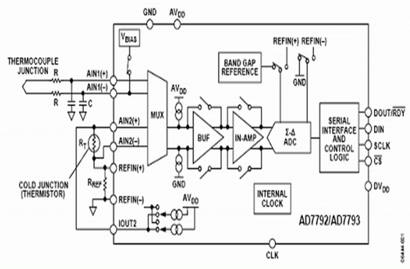 圖1給出利用3通道、16/24位AD7792/AD7793Σ-Δ模數(shù)轉(zhuǎn)換器(也可以使用6通道AD7794/AD7795)的熱電偶系統(tǒng)。其片內(nèi)儀表放大器首先對熱電偶電壓進(jìn)行放大,然后通過模數(shù)轉(zhuǎn)換器對放大的電壓信號(hào)進(jìn)行模數(shù)轉(zhuǎn)換。熱電偶產(chǎn)生的電壓偏置在地電平附近。片內(nèi)激勵(lì)電壓源將其偏置到放大器線性范圍以內(nèi),因此系統(tǒng)能夠利用單電源工作。這種低噪聲、低漂移、片內(nèi)、帶隙基準(zhǔn)電壓源,能夠確保模數(shù)轉(zhuǎn)換的精度,從而保證整個(gè)溫度測量系統(tǒng)的精度。