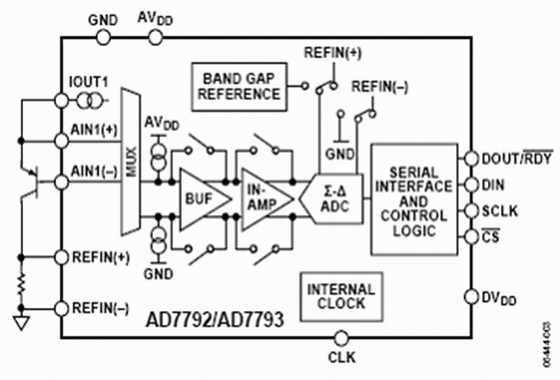 儀表放大器允許開發(fā)低噪聲、低溫漂的增益級電路。低噪聲與低溫漂非常關(guān)鍵,可以保證因溫度變化引起的電壓變化大于儀表放大器的噪聲電壓。AD7793的增益可以設(shè)置為1, 2, 4, 8, 16, 32, 64,或128。利用128倍的最大增益設(shè)置以及產(chǎn)生的基準(zhǔn)電壓源,AD7793的滿度范圍是±1.17 mV/128 mV或者大約±10 mV。這樣,ADC的高分辨率特點(diǎn)保證無需任何外部放大器元件就可以達(dá)到最佳效果。