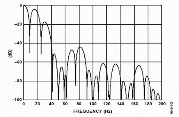 Σ-Δ模數(shù)轉(zhuǎn)換器的內(nèi)置數(shù)字濾波器對于抑制帶外量化噪聲以及其他噪聲源非常有效。噪聲源之一是電力網(wǎng)供電系統(tǒng)產(chǎn)生的頻率。當(dāng)電力網(wǎng)為器件供電時(shí),將產(chǎn)生50 Hz及其倍頻的供電系統(tǒng)頻率(在歐洲),或產(chǎn)生60 Hz及其倍頻的供電系統(tǒng)頻率(在美國)。窄帶模數(shù)轉(zhuǎn)換器主要采用sinc濾波器。AD7793有4個(gè)濾波器選項(xiàng),模數(shù)轉(zhuǎn)換器可以根據(jù)更新速率自動(dòng)選擇需要使用的濾波器種類。在16.6 Hz的更新速率使用sinc3濾波器。如圖5所示,sinc3濾波器在頻譜內(nèi)存在凹槽。當(dāng)輸出字速率為16.6 Hz時(shí),可以利用這些凹槽同時(shí)抑制50 Hz或60 Hz的頻率。