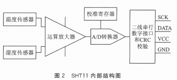 溫濕度傳感器SHTl1將溫度感測(cè)、濕度感測(cè)、信號(hào)變換、A/D轉(zhuǎn)換和加熱器等功能集成到一個(gè)芯片上,其內(nèi)部結(jié)構(gòu)如圖2所示。該芯片包括一個(gè)電容性聚合體濕度敏感元件和一個(gè)用能隙材料制成的溫度敏感元件。這兩個(gè)敏感元件分別將濕度和溫度轉(zhuǎn)換成電信號(hào),該電信號(hào)首先進(jìn)入微弱信號(hào)放大器進(jìn)行放大;然后進(jìn)入一個(gè)14位的A/D轉(zhuǎn)換器;最后經(jīng)過二線串行數(shù)字接口輸出數(shù)字信號(hào)。SHT11在出廠前,都會(huì)在恒濕或恒溫環(huán)境中進(jìn)行校準(zhǔn),校準(zhǔn)系數(shù)存儲(chǔ)在校準(zhǔn)寄存器中;在測(cè)量過程中,校準(zhǔn)系數(shù)會(huì)自動(dòng)校準(zhǔn)來自傳感器的信號(hào),此外,SHT11內(nèi)部還集成了一個(gè)加熱元件,加熱元件接通后可以將SHTll的溫度升高5℃左右,同時(shí)功耗也會(huì)有所增加。此功能主要為了比較加熱前后的溫度和濕度值,可以綜合驗(yàn)證兩個(gè)傳感器元件的性能。在高濕(>95%RH)環(huán)境中,加熱傳感器可預(yù)防傳感器結(jié)露,同時(shí)縮短響應(yīng)時(shí)間,提高精度。加熱后SHTll溫度升高、相對(duì)濕度降低,較加熱前,測(cè)量值會(huì)略有差異。