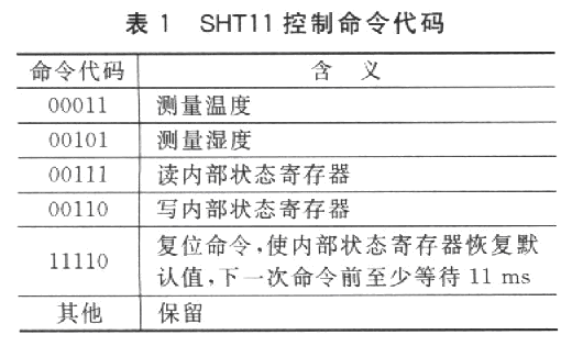 微處理器是通過二線串行數(shù)字接口與SHTl1進(jìn)行通信的。通信協(xié)議與通用的I2C總線協(xié)議是不兼容的,因此需要用通用微處理器I/O口模擬該通信時(shí)序。微處理器對(duì)SHTll的控制是通過5個(gè)5位命令代碼來實(shí)現(xiàn)的,命令代碼的含義如表1所列。
