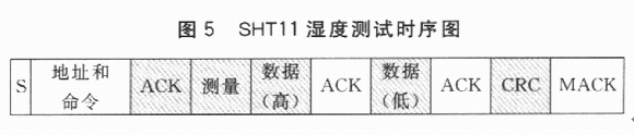 SHTll濕度測(cè)試時(shí)序如圖5所示。其中,陰影部分為SHTll控制總線。主機(jī)發(fā)出啟動(dòng)命令,隨后發(fā)出一個(gè)后續(xù)8位命令碼。該命令碼包含3個(gè)地址位(芯片設(shè)定地址為000)和5個(gè)命令位;發(fā)送完該命令碼,將DATA總線設(shè)為輸入狀態(tài)等待SHTll的響應(yīng);SHTll接收到上述地址和命令碼后,在第8個(gè)時(shí)鐘下降沿,將DATA下拉為低電平作為從機(jī)的ACK;在第9個(gè)時(shí)鐘下降沿之后,從機(jī)釋放DATA(恢復(fù)高電平)總線;釋放總線后,從機(jī)開始測(cè)量當(dāng)前濕度,測(cè)量結(jié)束后,再次將DATA總線拉為低電平;主機(jī)檢測(cè)到DATA總線被拉低后,得知濕度測(cè)量已經(jīng)結(jié)束,給出SCK時(shí)鐘信號(hào);從機(jī)在第8個(gè)時(shí)鐘下降沿,先輸出高字節(jié)數(shù)據(jù);在第9個(gè)時(shí)鐘下降沿,主機(jī)將DATA總線拉低作為ACK信號(hào),然后釋放總線DATA;在隨后8個(gè)SCK周期下降沿,從機(jī)發(fā)出低字節(jié)數(shù)據(jù);接下來的SCK下降沿,主機(jī)再次將DATA總線拉低作為接收數(shù)據(jù)的ACK信號(hào);最后8個(gè)SCK下降沿從機(jī)發(fā)出CRC校驗(yàn)數(shù)據(jù),主機(jī)不予應(yīng)答(NACK)則表示測(cè)量結(jié)束。